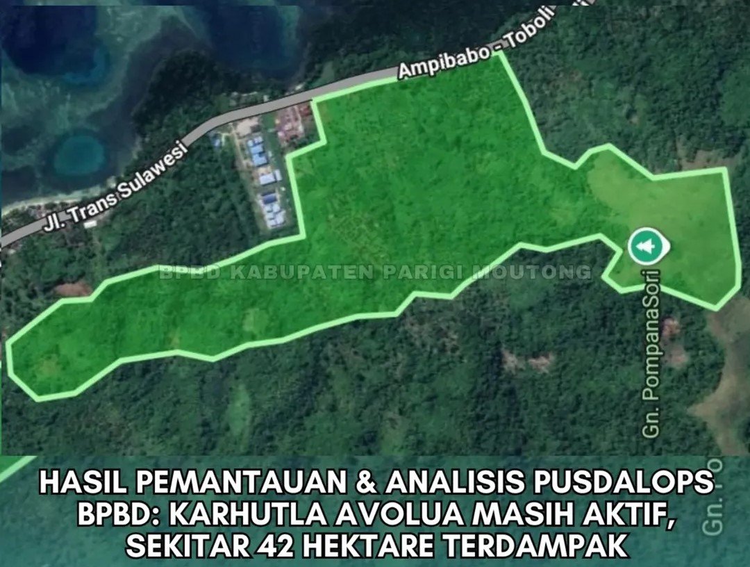 Berdasarkan hasil pemantauan dan analisis Pusat Pengendalian Operasi (Pusdalops) Badan Penanggulangan Bencana Daerah (BPBD) Kabupaten Parigi Moutong, luas lahan yang terbakar dan terdampak karhutla diperkirakan mencapai sekitar 42 hektare. Data tersebut dihimpun selama tiga hari pascakejadian, dengan wilayah terdampak didominasi kawasan perbukitan dan hutan yang memiliki tingkat kekeringan cukup tinggi.