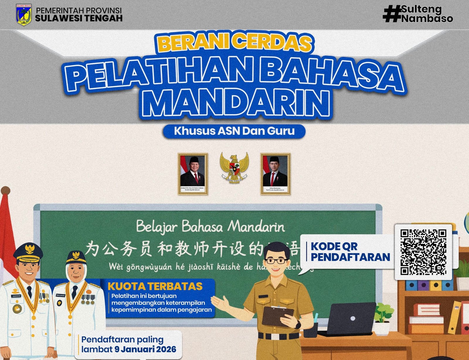 Soalparigi.id – Pemerintah Provinsi Sulawesi Tengah melalui program Berani Cerdas membuka Pelatihan Bahasa Mandarin secara gratis bagi Aparatur Sipil Negara (ASN), guru, serta masyarakat umum. Program ini bertujuan meningkatkan kapasitas sumber daya manusia, khususnya dalam penguasaan bahasa asing yang relevan dengan kebutuhan global.